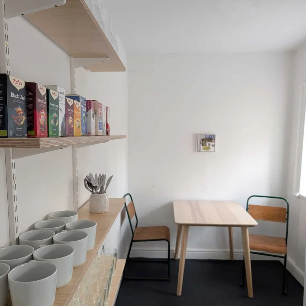 There is a small kitchen and break area with a selection of complimentary teas, a fridge, a dishwasher plus cups and water jugs.
